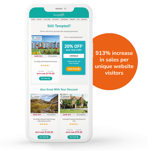 Buyagift’s revamped browse abandonment program has led to an increase in sales per website visitor too. “Sales per unique website visitor are up 913%,” explains Charles.